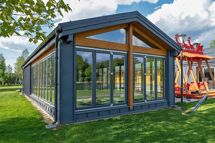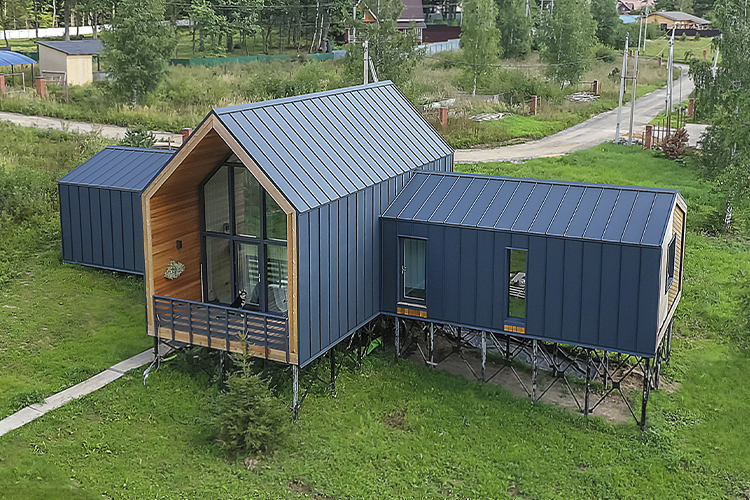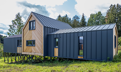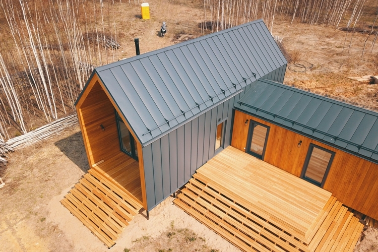 Популярными материалами для обшивки барнхаусов являются Кликфальц и Кликфальц PRO Grand Line. Это стильный, надежный материал, который удобно и легко монтируется как на кровлю, так и на фасад. Листы крепятся к обрешетке саморезами через отверстия вдоль замочной части кровли без использования специального оборудования.