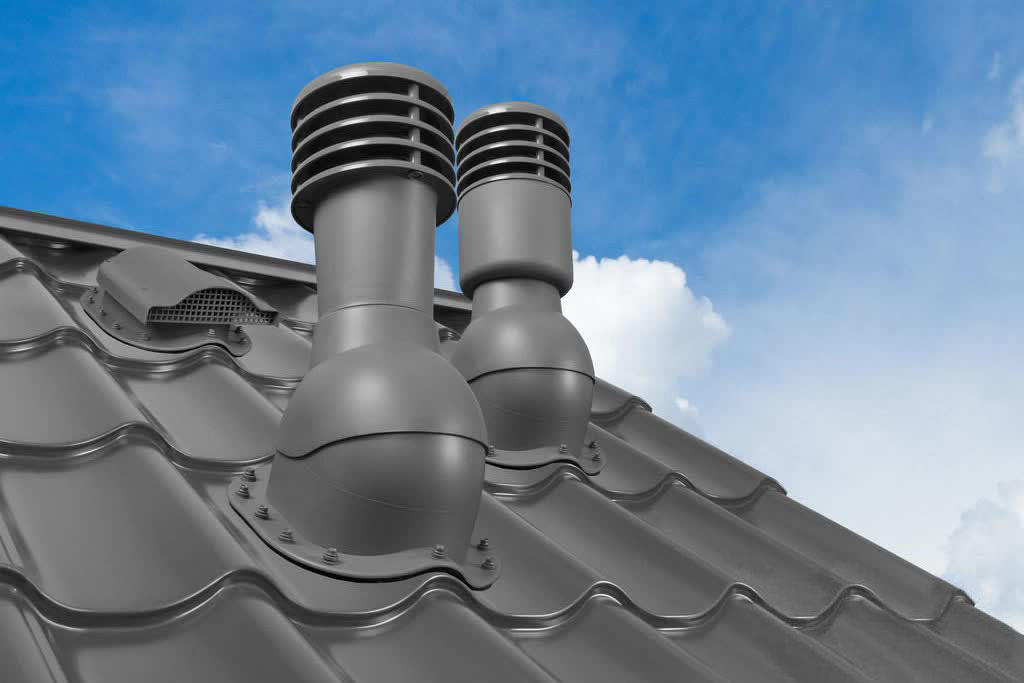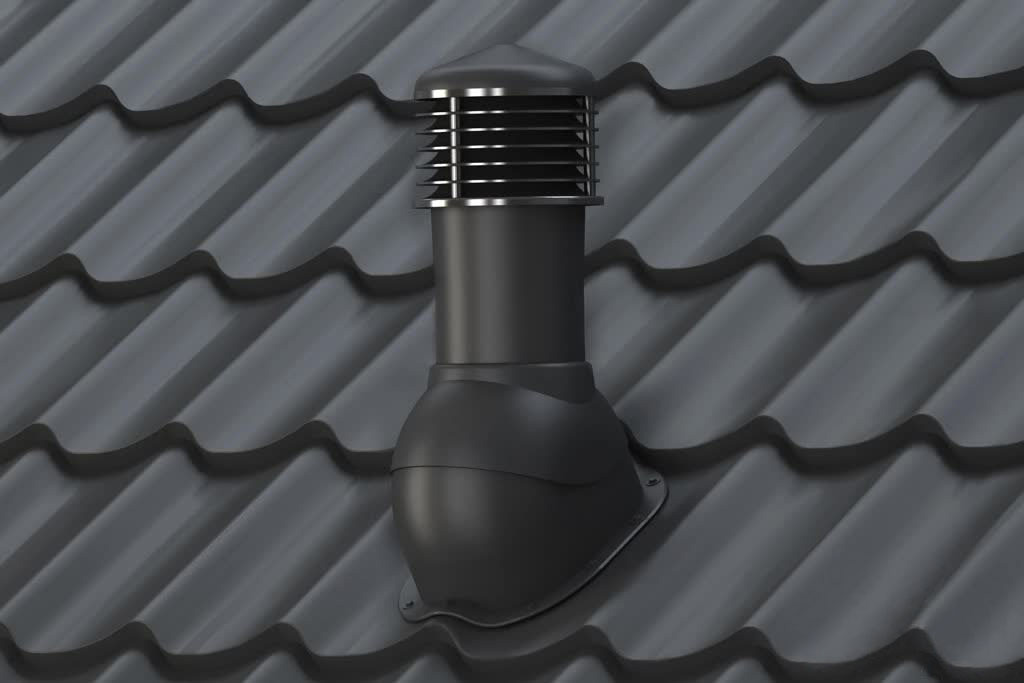 Комплект вентиляционного выхода, изолированный/ утепленный вариант (предотвращает образование конденсата в вентиляционном канале), с проходным элементом для кровли из металлочерепицы: