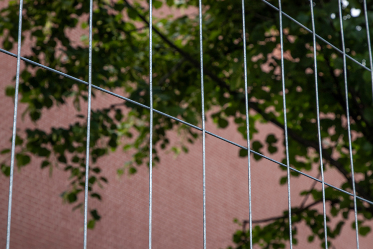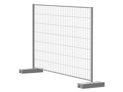 Временное ограждение Euro состоит из секций, бетонных оснований и креплений временного ограждения. Секции временного ограждения Euro 1,95×3,45 метра изготовлены из сварных панелей 1,79х3,36 метра без гибов, приваренных к рамкам из труб 41х21 мм и столбов 51 мм высотой 1,95 метра. Панель выполнена из горячеоцинкованных прутков диаметром 3,0 мм. Для возведения ограждения необходимо расставить бетонные основания, установить готовые секции и скрепить их между собой креплениями временных ограждений.
