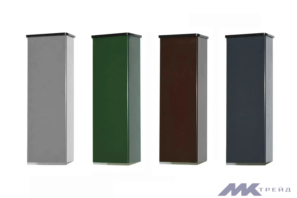 Столбы с верхней заглушкой для 3д заборов изготавливаются из горячеоцинкованного листа толщиной 1,2 мм с прямоугольным сечением 36х56 мм. В каталоге МКтрейд есть столбы как для заборов без полимерного покрытия, так и в стандартных цветах секций: зеленом, коричневом и темно-сером.